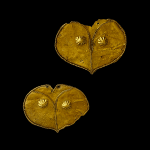 Two delicate gold appliqués, each shaped as a stylised heart or leaf form, hammered from